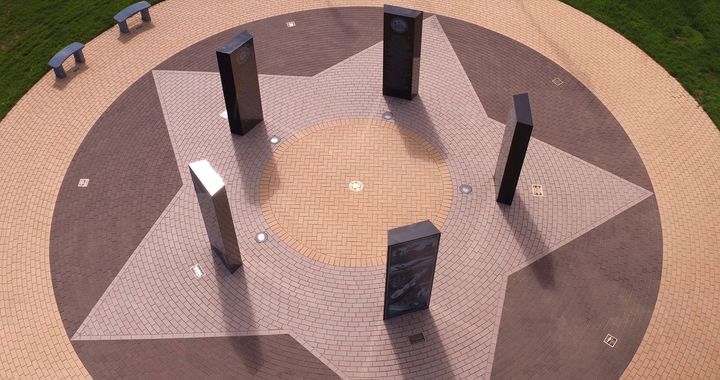 brass globe and eagle. Inscribed bricks line the memorial walk.